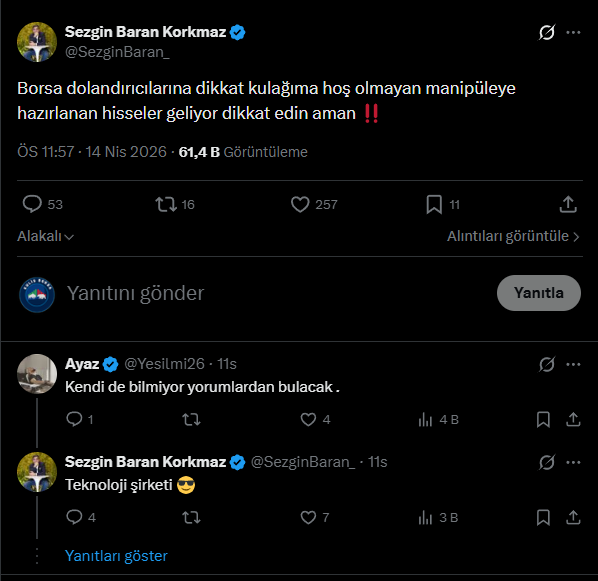 Korkmaz’ın paylaşımında özellikle “manipülasyona hazırlanmış hisseler” ifadesi dikkat çekerken, kullanıcıların bazıları hangi hisse sorusunu sordu. Korkmaz buna karşılık olarak 'Teknoloji şirketi' cevabını verdi.